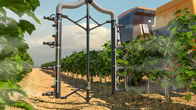 De wijnbouwer profiteert van het op twee manieren aanpassen van de helling van de spuitboom: ten eerste worden de gewasbeschermingsmiddelen nog steeds nauwkeurig op het bladoppervlak aangebracht en ten tweede beschadigen de bomen geen enkele plant terwijl de spuitmachine rond beweegt de wijngaard.