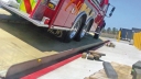 De Amerikaanse Ferrara Fire Apparatus Inc. Doet stabiliteitsproeven met brandweerwagens op kieptafels met behulp van Turck inclinatie sensoren om stabiliteit zeker te stellen in het veld.